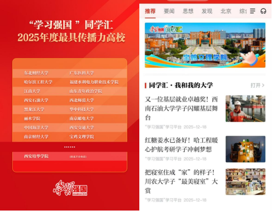 “同学汇”是“学习强国”为推动党的创新理论进校园、进课堂、进学生头脑而研发的一款青年思政社交产品,是大学生版“学习强国”。自2025年5月开通“学习强国”同学汇学校账号以来,党委宣传部积极整合优质资源,精准定位传播方向,累计发布各类作品30余篇,学校及内容多次被“学习强国”学习平台“同学汇•我和我的大学”栏目首页推荐位展示,有效扩大了校园故事的传播覆盖面与影响力。
