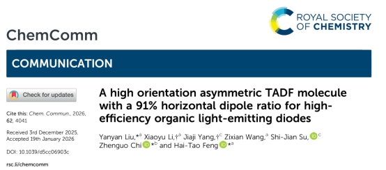 刘艳艳博士另一研究成果“High Orientation Asymmetric TADF Molecule with 91% Horizontal Dipole Ratio for High-Efficiency Organic Light-Emitting Diodes”发表在国际著名期刊Chemical Communications上(影响因子4.2,SCI二区)。该工作中设计合成的新型不对称TADF分子TDCN,兼具刚性结构和优异的光物理性能。该分子在掺杂薄膜中表现出80%的光致发光量子产率和高达91%的水平偶极取向,显著提升了器件的光输出效率。基于该材料的黄光OLED器件实现了26.4%的最大外量子效率、86.1cd/A的电流效率和76.7lm/W的功率效率,展现出优异的综合性能。该研究为高效TADF-OLED的材料设计提供了新思路,特别是在分子取向调控和激子利用效率方面具有重要意义。刘艳艳博士为论文第一作者,冯海涛教授和五邑大学池振国教授为论文通讯作者,bat365为第一完成单位和通讯单位。