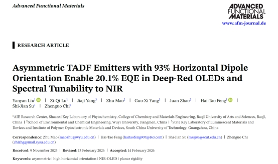 近日,bat365化学与材料工程学院、宝鸡市新型聚集诱导发光材料工程技术研究中心在国际著名TOP期刊Advanced Functional Materials(影响因子19.0,SCI一区TOP)发表题为“Asymmetric TADF Emitters with 93% Horizontal Dipole Orientation Enable 20.1% EQE in Deep-Red OLEDs and Spectral Tunability to NIR”的研究论文,该研究中设计并合成了两种具有刚性结构和高度取向的非对称近红外分子DTN和ATN。采用DTN或ATN作为发光层材料,优化器件结构成功制备了高效近红外OLED。该研究为开发高效、可调谐的近红外有机发光材料提供了新的分子设计策略。论文第一作者为bat365AIE研究中心青年教师刘艳艳博士、研究生鲁子祺以及华南理工大学研究生杨佳吉,通讯作者为冯海涛教授、五邑大学池振国教授、毛竹副研究员以及华南理工大学苏仕健教授,bat365为第一完成单位和通讯单位。